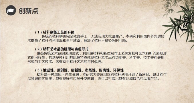 作品實用性:有利于非遺文化的保護,并使其可以與時俱進滿足現代審美,也解決了大批農村人口就業問題。該設計拓展了秸稈的應用領域,減少了秸稈處理的壓力。設計的作品高端典雅,使秸稈變廢為寶,實現了工業化生產,具有良好的使用前景,并符合棗莊當前經濟轉型的大勢。