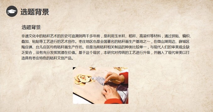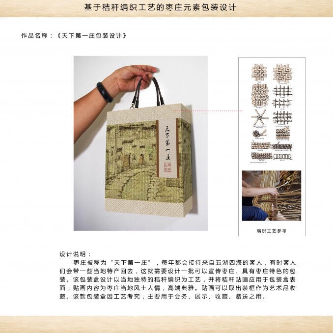 作品創意點:將傳統的秸稈編織技術進行現代化升級,使其滿足現代人們的審美,提高了其工業化生產能力。設計作品古樸典雅,既體現了棗莊當地的特色,又增加了包裝的趣味性,且設計理念低碳環保,符合國家對綠色經濟的提倡。