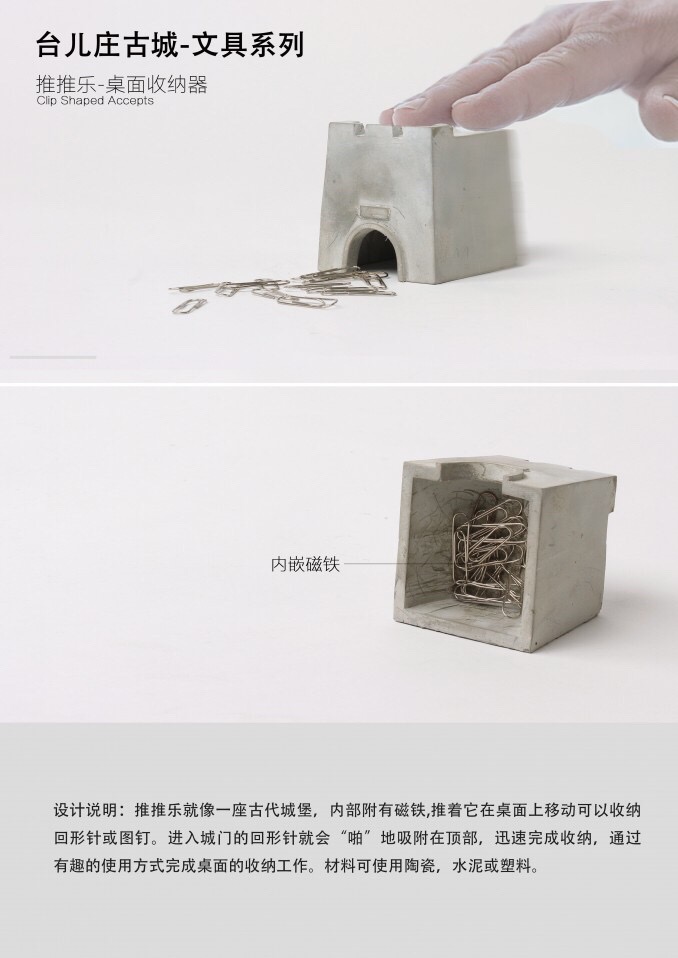 推推樂:就像一座古代城堡,內部附有磁鐵,推著它在桌面上移動可以收納回形針或圖釘。進入城門的回形針就會“啪”地吸附在頂部,迅速完成收納,通過有趣的使用方式完成桌面的收納工作。材料可使用陶瓷,水泥或塑料。