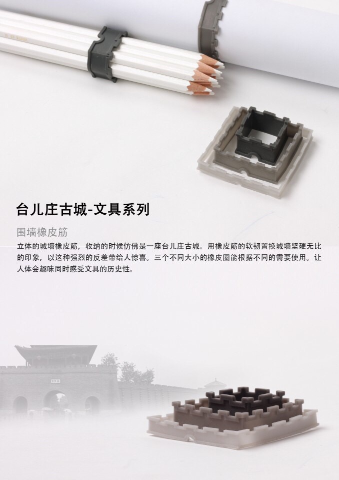 立體的城墻橡皮筋,收納的時候仿佛是一座臺兒莊古城。用橡皮筋的軟韌置換城墻堅硬無比的印象,以這種強烈的反差帶給人驚喜。三個不同大小的橡皮圈能根據不同的需要使用。讓人體會趣味同時感受文具的歷史性。