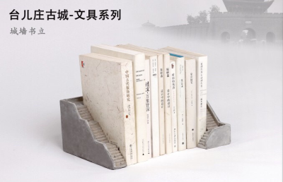 城墻書立;書是歷史的載體,書也是一座古城。微建筑書檔與書組成一座完整的臺兒莊建筑,讓人有種沿著樓道攀上歷史的書堆里的想法,營造一種趣味的視覺感。材料可使用陶瓷,水泥或塑料。