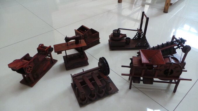 將棗莊本地特色的農村用具用木雕的手法表現出來