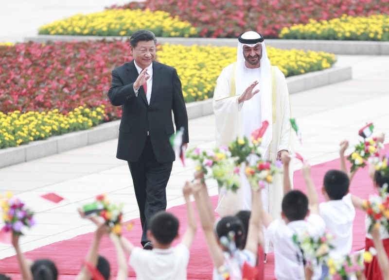 7月22日,國家主席習近平在北京人民大會堂同阿聯酋阿布扎比王儲穆罕默德舉行會談。這是會談前,習近平在人民大會堂東門外廣場為穆罕默德舉行歡迎儀式。新華社記者 龐興雷 攝
