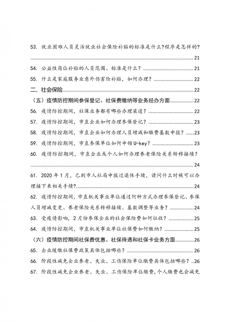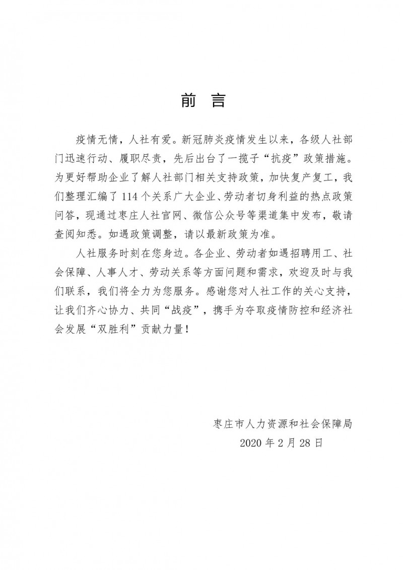 疫情無情,人社有愛。新冠肺炎疫情發生以來,各級人社部門迅速行動、履職盡責,先后出臺了一攬子抗“疫”政策措施。為更好的幫助企業和勞動者了解人社部門相關支持政策,加快復產復工,市人社局整理匯編了《人社部門疫情防控熱點政策問答》,共收錄就業創業、社會保障、勞動關系、人事人才等四類問答114個,歡迎全市廣大企業和勞動者查閱使用。今后我們將根據政策增加或變化及時進行動態調整。