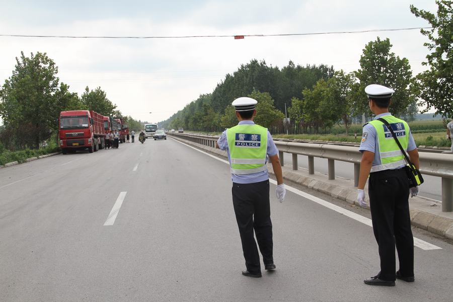圖③:在城區道路的重點路段,網格員向路邊??康娜嗆嚢l放交通安全知識宣傳資料。