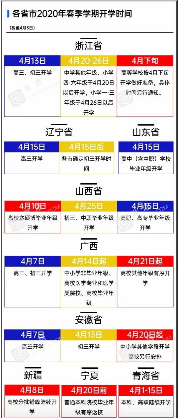 青海自4月1日起組織了高校開學工作,成為國內首個明確高校開學時間的省份,4月1日,青海柴達木職業技術學院率先開學,成為國內首批開學的高校。 新疆也將自4月8日起陸續跟進,高校將分批錯峰開學。 4月1日,山西發布消息,明確該省高校本碩博畢業年級和高職高專畢業年級原則上分別從4月10日、4月15日起錯峰分批開學,一周內基本實現整體開學。 寧夏也發布了高校開學時間,計劃區內普通本科院校畢業年級學生4月20日前有序返校復課;