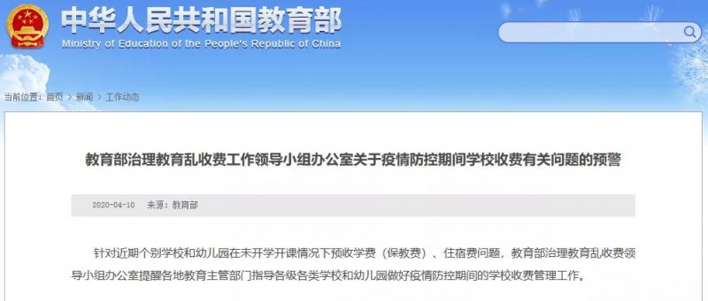 教育部網(wǎng)站4月10日發(fā)布預(yù)警,進一步規(guī)范和加強疫情防控期間學校收費管理。