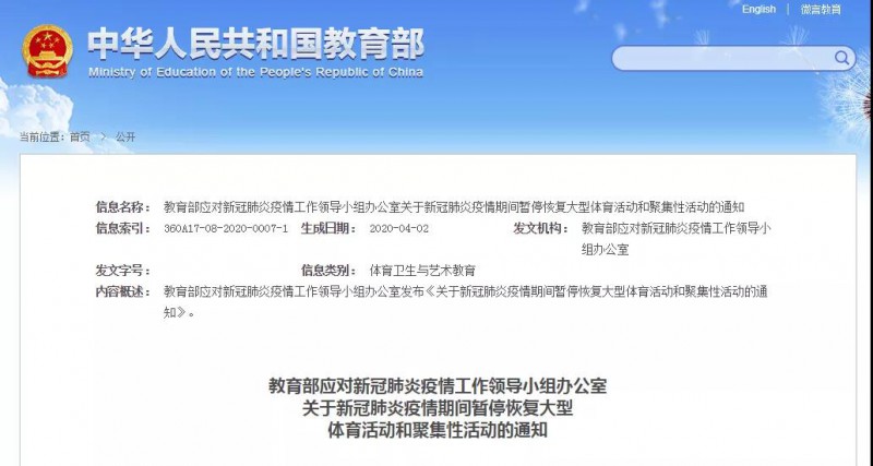 各省、自治區、直轄市教育廳(教委),新疆生產建設兵團教育局,部屬各高等學校、部省合建各高等學校:當前全國本土疫情傳播已基本阻斷,但境外疫情呈加速擴散蔓延態勢,我國疫情輸入壓力持續加大。大型體育活動和聚集性活動人員集散量大、流動量大,疫情傳播風險較大。為切實保障廣大師生生命安全和身體健康,現就新冠肺炎疫情期間暫停恢復大型體育活動和聚集性活動有關事宜通知如下。各地各校要堅決貫徹落實習近平總書記關于堅決打贏疫情防控阻擊戰的重要指示精神,切實增強“四個意識”、堅定“四個自信”、做到“兩個維護”,堅持實施“外防輸入、內防反彈”的防控策略,針對當前境外輸入型病例與風險增加的嚴峻形勢,繼續保持高度警惕,堅決防止麻痹僥幸心理,壓實防控責任,落實防控措施。為減少人員聚集和流動給疫情防控帶來的風險,新冠肺炎疫情期間暫停恢復學校體育單項賽事、綜合性運動會等大型體育活動和聚集性活動。各地各校要堅持審慎原則,完善有關組織和工作機制,提前謀劃相關活動預案,做好活動賽期等調整工作。各地各校要針對疫情防控要求,統籌調整年度體育教育教學、運動訓練與學生鍛煉活動計劃,合理制定教學組織實施方案。要充分利用網絡平臺,深入推進學校體育教學改革,聚焦“教會、勤練、常賽”目標,注重“教健康知識、傳運動技能、練身體素質、育品德意志”,不斷豐富學校體育教學、訓練、競賽等組織形式,減少人員聚集,幫助學生通過體育鍛煉“享受樂趣、增強體質、健全人格、錘煉意志”。各地各校要高度重視,切實加強組織領導,相關工作進展及時向教育部應對新冠肺炎疫情工作領導小組辦公室報告。教育部將根據疫情防控形勢及時對有關活動安排作出調整。
