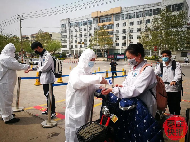 上午6時(shí)許,棗莊日?qǐng)?bào)全媒體記者看到,公安、交警、城管等部門工作人員早早就來到校園門前,為每一位入校學(xué)生保駕護(hù)航。而每一位高三學(xué)生分隔保持兩米的安全間距離排隊(duì)入校,學(xué)校安全防護(hù)人員則是細(xì)心地為每一位學(xué)生做好防護(hù)工作。