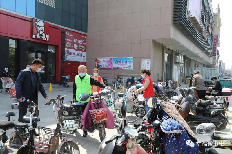 在大潤發超市門前廣場,志愿者們向前來購物的市民發放了志愿服務宣傳倡議書,宣傳衛生健康防疫知識,并將超市門口的電動車擺放整齊。