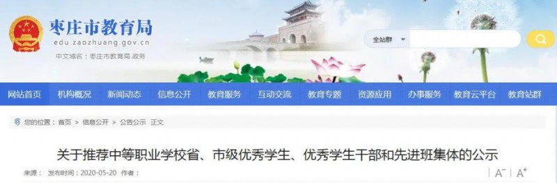 根據(jù)省教育廳《關(guān)于做好2019學(xué)年高中階段學(xué)校學(xué)生省級評優(yōu)工作的通知》(魯教基函[2020]11號)和《棗莊市教育局關(guān)于推薦評選2019學(xué)年中等職業(yè)學(xué)校省、市級優(yōu)秀學(xué)生優(yōu)秀學(xué)生干部和先進(jìn)班集體的通知》(棗教函〔2020〕13號)要求,經(jīng)學(xué)校和區(qū)(市)教體局層層推薦,市教育局審查,現(xiàn)將省、市級優(yōu)秀學(xué)生、優(yōu)秀學(xué)生干部和先進(jìn)班集體人選予以公示。