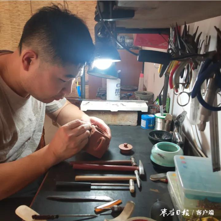 32歲的孫啟亮老家在臺兒莊農村,多年前他靠著自己的手藝來到市中區生活、工作,培植的花木及制作的盆景很受市場歡迎,在這個行業內有著一定的知名度,經常應邀出去交流技藝。孫啟亮自幼愛好紫砂壺、瓷器等藝術品,他曾摸索著制作紫砂壺,后來看到有人給破碎的紫砂壺進行修復、鋦瓷,很感興趣,便開始自學鋦瓷技藝。為了提高技藝,他到處求師學藝,后來拜在高密鋦瓷大師候建山先生門下,系統學習了鋦瓷技藝,終于將這門技藝全部掌握。