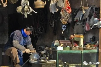 鐵匠 一般都有店鋪,叫鐵匠鋪、鐵匠爐、紅爐等,走村串鄉(xiāng)的稱“行爐”。鐵匠又有專行的鐵匠,有專打菜刀一類的,有專做剪刀一類的,有專打農(nóng)具一類的。鐵匠操作一般要2人,有掌握火侯、掌小錘定型的,有光管拉風箱、打下錘(大錘)的。流動紅爐主要是按農(nóng)時給農(nóng)具淬火加鋼、進行維修等。