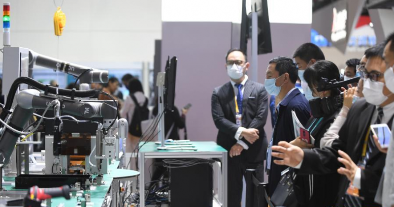 2020年11月6日,在進(jìn)博會(huì)技術(shù)裝備展區(qū),人們?cè)谖鏖T子展臺(tái)觀看人機(jī)協(xié)作的智能化單元生產(chǎn)線。新華社記者 李任滋 攝