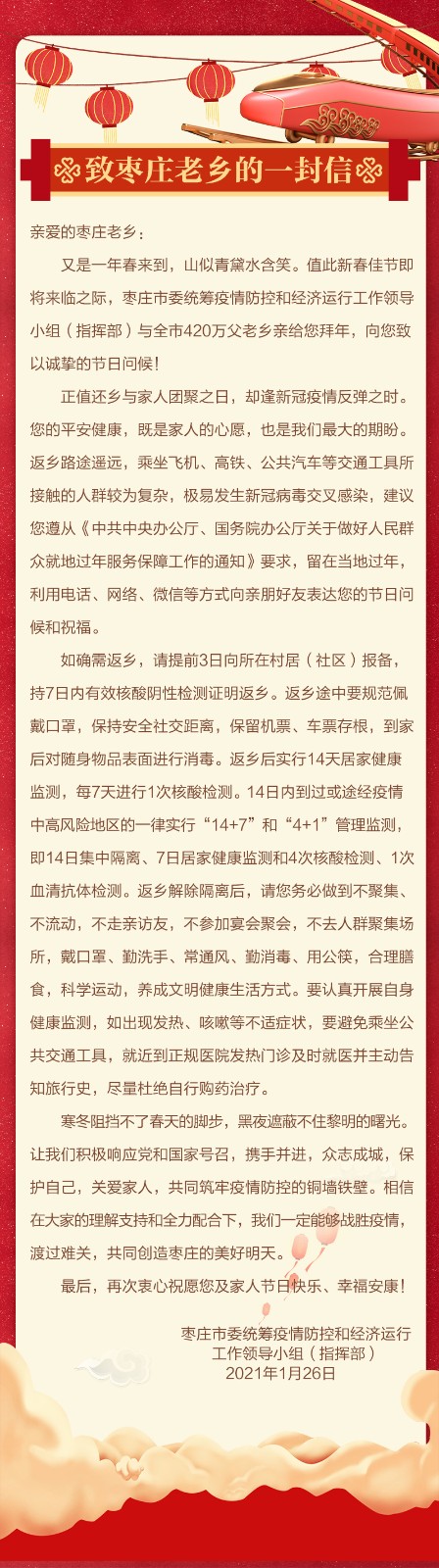 1月26日,棗莊市委統籌疫情防控和經濟運行工作領導小組(指揮部)發布致棗莊老鄉的一封信。