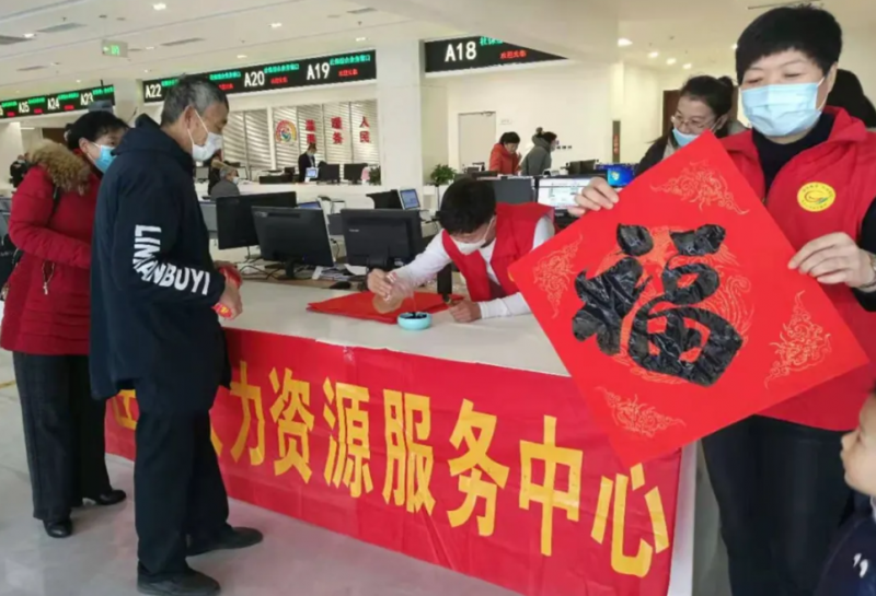 2月8日,棗莊市人力資源服務中心黨員志愿者服務隊來到市民中心,為辦事群眾送上新年祝福。