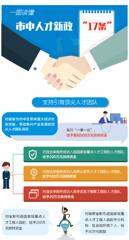 印發(fā)《中共市中區(qū)委 市中區(qū)人民政府關(guān)于做好人才支撐新舊動能轉(zhuǎn)換的十七條意見》,出臺17條務(wù)實管用、具有比較優(yōu)勢的扶持政策,有針對性地制定17項實施細則,設(shè)立1000萬元人才專項資金,并通過網(wǎng)站、微信進行廣泛宣傳,印制發(fā)放有關(guān)宣傳彩頁3000余份,確保人才新政落實落地。