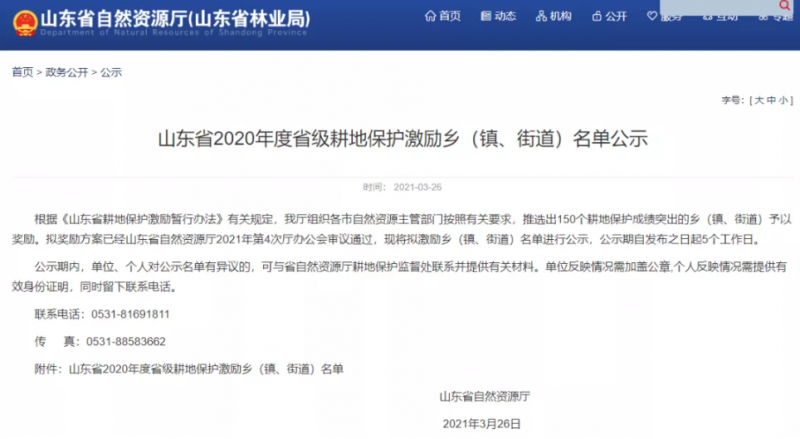 根據《山東省耕地保護激勵暫行辦法》有關規定,我廳組織各市自然資源主管部門按照有關要求,推選出150個耕地保護成績突出的鄉(鎮、街道)予以獎勵。擬獎勵方案已經山東省自然資源廳2021年第4次廳辦公會審議通過,現將擬激勵鄉(鎮、街道)名單進行公示,公示期自發布之日起5個工作日。? 公示期內,單位、個人對公示名單有異議的,可與省自然資源廳耕地保護監督處聯系并提供有關材料。單位反映情況需加蓋公章,個人反映情況需提供有效身份證明,同時留下聯系電話。 聯系電話:0531-81691811 傳? ? 真:0531-88583662 附件:山東省2020年度省級耕地保護激勵鄉(鎮、街道)名單 山東省自然資源廳 2021年3月26日 趕緊來看下 入圍該名單的 鄉(鎮、街道)都有哪些 山東省2020年度 省級耕地保護激勵鄉(鎮、街道)名單 ??點擊圖片查看大圖??