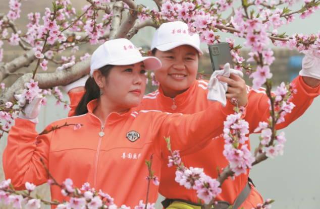 圖為游客在欣賞桃花。