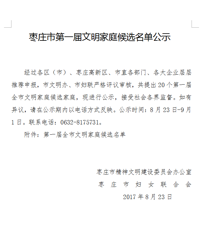 第一屆全市文明家庭候選名單 趙月敬家庭 薛城區常莊鎮常莊村 王克立家庭 兗礦魯南化工有限公司 渠 嵩家庭 市中區文苑小區 李海榮家庭 滕州市龍騰花園小區 張厚寬家庭 滕州市龍泉街道蘋果花園小區 王 艷家庭 棗莊市臺兒莊區政府宿舍 楊孝義家庭 滕州市善南街道高莊居 楊秀偉家庭 滕州市蘋果花園 陳繼軍家庭 山亭區新城太清湖潤景家園 楊守信家庭 山亭區店子鎮店子村 丁永亮家庭 臺兒莊區金光路西苑小區 孫士國家庭 滕州市東郭鎮大塢溝村 任振金家庭 山亭區北莊鎮東莊村 王福艷家庭 臺兒莊區政府宿舍 李廣靖家庭 高新區興城街道安康苑 孔慶龍家庭 臺兒莊區運河街道西苑小區 程 會家庭 嶧城區壇山街道中心社區 孫華北家庭 薛城區周營鎮北李莊村 劉慶云家庭 嶧城區峨山鎮前屯村 俞廷勤家庭 滕州市洪緒鎮泉興礦業公司生活區