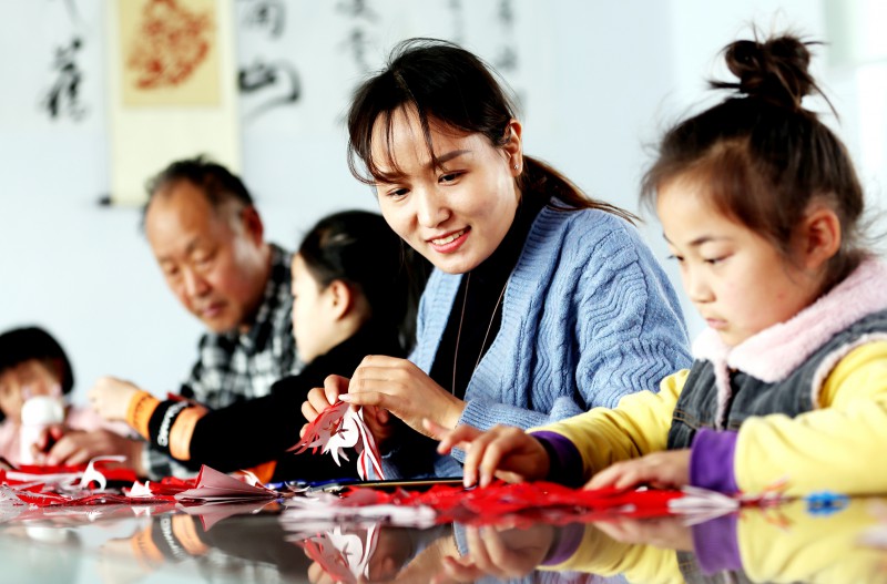 3月28日,在臺(tái)兒莊區(qū)文化館,學(xué)生在跟著非遺傳承人王廣明老人學(xué)剪紙。臺(tái)兒莊區(qū)長(zhǎng)期舉辦剪紙、面塑和柳琴戲等非遺項(xiàng)目公益培訓(xùn)班,在周末和節(jié)假日組織小學(xué)生學(xué)習(xí)實(shí)踐,既能讓學(xué)生們學(xué)習(xí)傳承非遺文化知識(shí),又鍛煉了動(dòng)手動(dòng)腦能力。