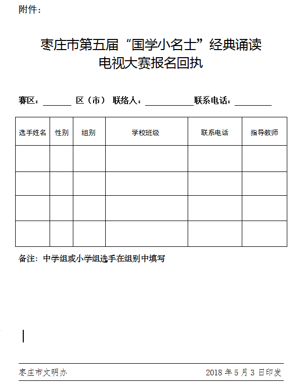 附件:棗莊市第五屆“國學小名士”經典誦讀電視大賽報名回執