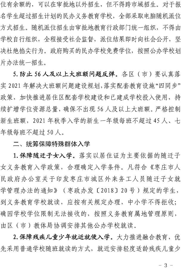 學校不得擅自招收在校留級學生,初中學校不得違規招收小學非畢業年級學生。要嚴格控制新生班額,2021年秋季入學的新生一年級每班不超過45人、七年級每班不超過50人。