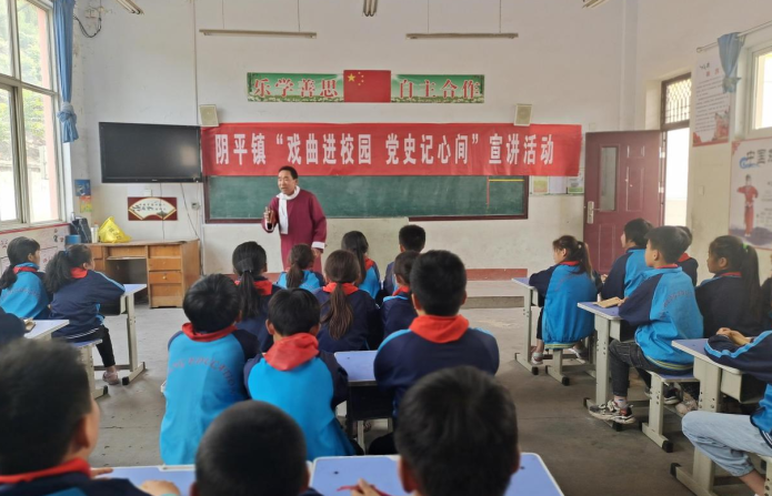 為迎接中國共產黨成立100周年,陰平鎮“戲曲進校園 黨史記心間”宣講活動走進白山前小學。夕陽紅藝術團的文藝志愿者來到學校,走進班級,為全校師生送來了一場紅色戲劇藝術的盛宴。學生們與文藝志愿者零距離接觸,面對面學習中國戲曲文化知識,對傳統戲曲文化有了初步的了解。戲曲社團的學生們圍著文藝志愿者,認真傾聽演唱,感受戲曲文化魅力,傳承紅色基因。
