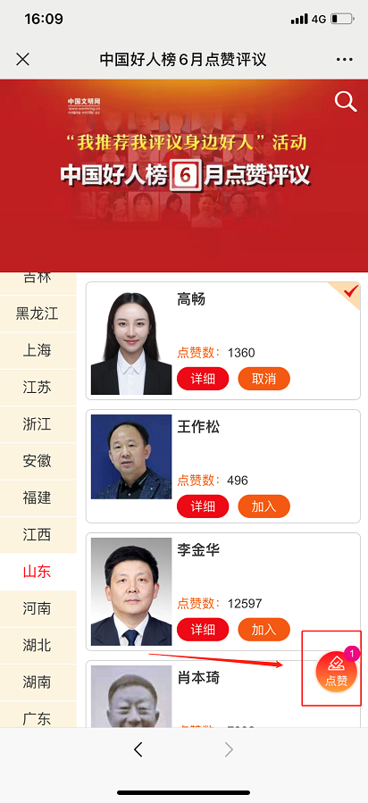 第三步:省份選擇“山東”,右側找到高暢,將她加入到點贊庫。