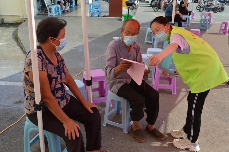 “后面的排好隊準備好,前面的馬上好啦!”護士們戴著防護帽、口罩、手套,站在門前,用嘶啞的聲音引導著居民有序接種。