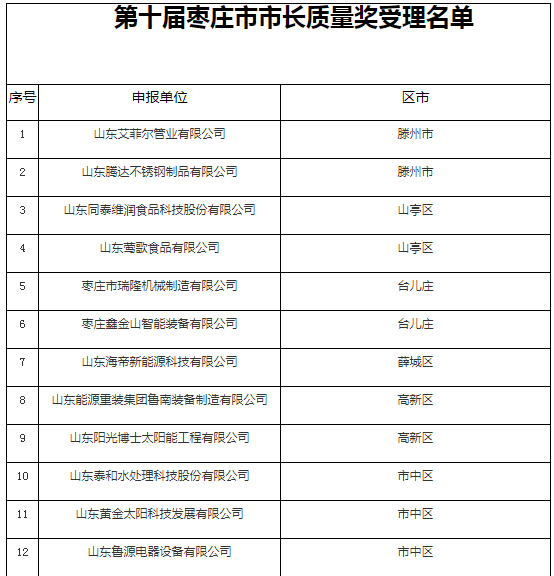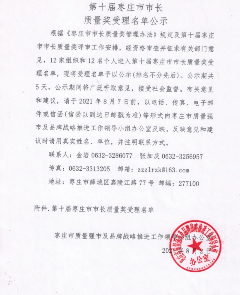 近日,從棗莊市質量強市及品牌戰略推進工作領導小組辦了解到,棗莊市市長質量獎第一階段的受理工作告一段落,共有12家組織和12名個人,進入第十屆棗莊市市長質量獎受理名單,將在下一階段競逐該項獎項。