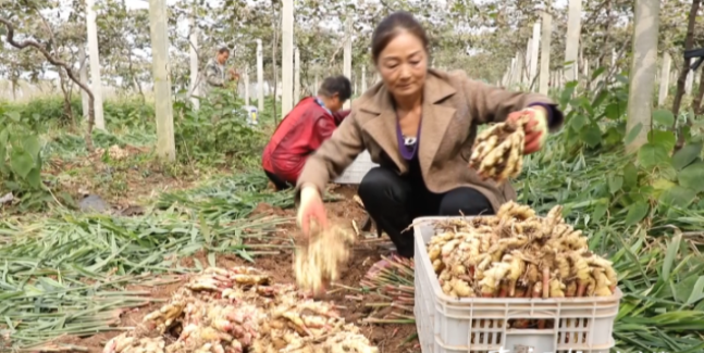 大姜種植戶馮海今年種植了20多畝姜,因為管理上心,大姜的長勢不錯。“咱這個獼猴桃園采用的是立體種植,獼猴桃上個月已經銷售完了。這兩天天氣涼了,準備開始收姜。今年雨水多,其他地方的姜大都泡壞了,咱這個地方地勢高,透水好,今天刨出來一看,比去年的姜還好呢。”馮海告訴記者,大姜種植成本包括姜芽、化肥、人工費等,一畝地要800斤姜芽,每斤五六塊錢,而化肥則包括復合肥、農家糞、豆子等,一畝大姜成本接近一萬元。雖說現在賣掉也能賺錢,但大多數姜農都不著急出售,通常他們選擇把鮮姜存到姜窖子里,一兩年之后再拿出來賣。