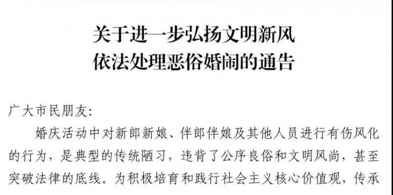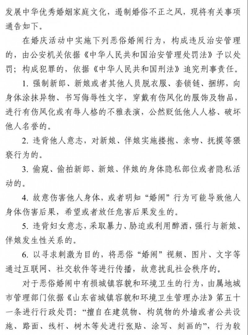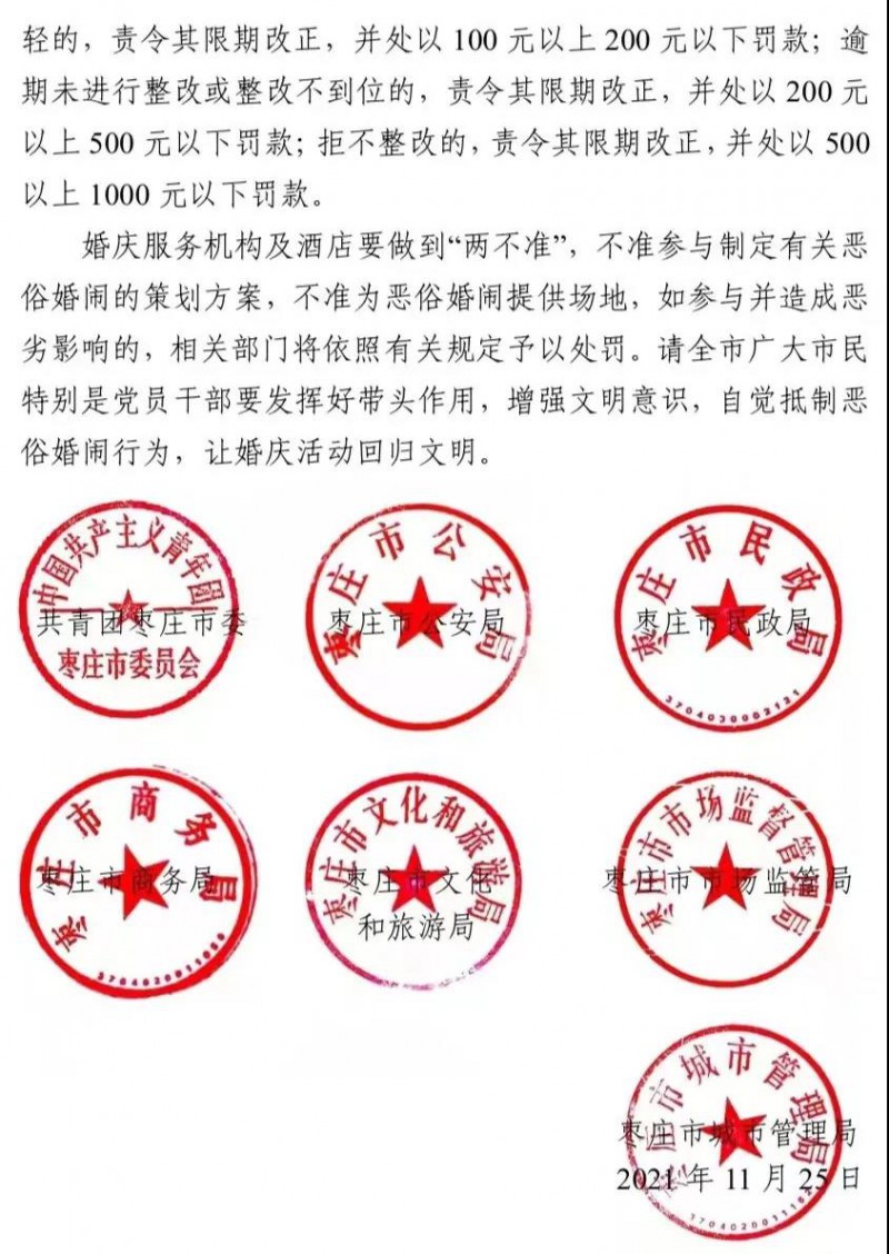 廣大市民: 近期棗莊市個別地方出現與移風易俗要求相違背、與社會文明風尚相抵觸、與優秀傳統文化相偏離的低俗、惡俗鬧婚現象,在社會上產生不良影響,嚴重影響全國文明城市創建工作。為堅決杜絕各類低俗、惡俗鬧婚現象的發生,推進我市移風易俗與文明城市創建工作順利開展,嚴禁在婚慶活動中實施下列低俗、惡俗鬧婚行為,具體公告如下: 任何公民都有權利和義務向有關部門報案、控告、舉報,構成違反治安管理的,由公安機關依法給予治安處罰,構成犯罪的,依法追究刑事責任。 請全市廣大群眾特別是黨員干部要發揮好帶頭作用,增強文明、法治意識,摒棄陳規陋習,自覺抵制低俗、惡俗鬧婚行為,推動全社會形成文明和諧婚姻新風! 棗莊市文明辦 共青團棗莊市委 棗莊市婦女聯合會 棗莊市公安局 棗莊市民政局 2021年10月18日