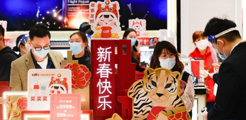 2022年2月3日,游客在中免集團(tuán)??谌赵聫V場(chǎng)免稅店選購(gòu)免稅品。新華社記者 楊冠宇 攝