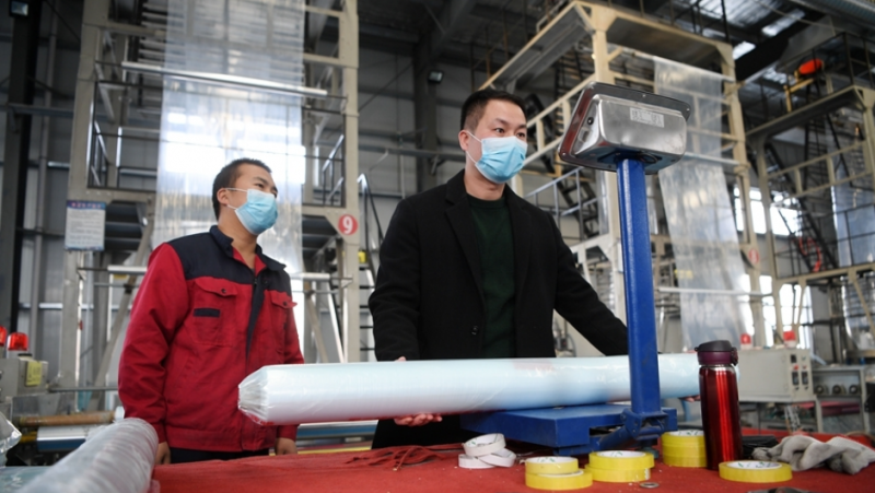 2022年1月28日,閩商鄭開(kāi)煌(右)在位于寧夏隆德縣閩寧扶貧產(chǎn)業(yè)園的農(nóng)用薄膜生產(chǎn)線(xiàn)查看產(chǎn)品質(zhì)量。新華社記者 王鵬 攝