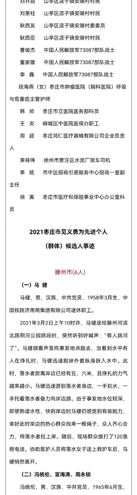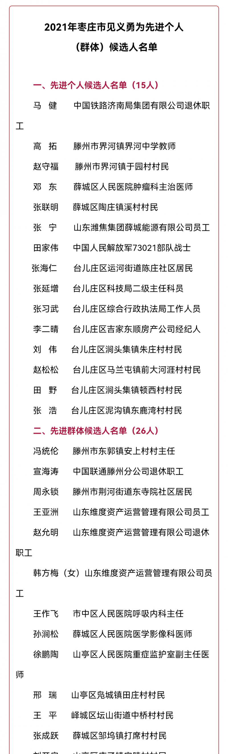 為使全市見義勇為先進個人(群體)的評選表彰工作公開、公平、公正透明,加大表彰宣傳力度,弘揚社會正能量,經(jīng)各區(qū)(市)、各有關(guān)單位按照有關(guān)評選條件和規(guī)定程序推薦,現(xiàn)將2021年棗莊市見義勇為先進個人(群體)候選人名單、事跡進行公示并接受群眾監(jiān)督。