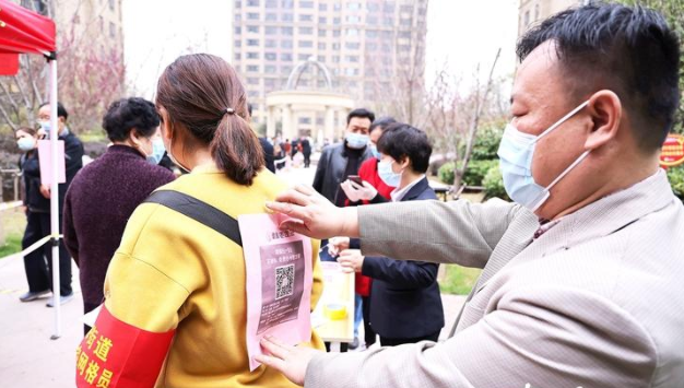 滕州志愿者將健康棗莊云二維碼貼在后背,方便群眾提前辦理預登記。 (渠青 攝)