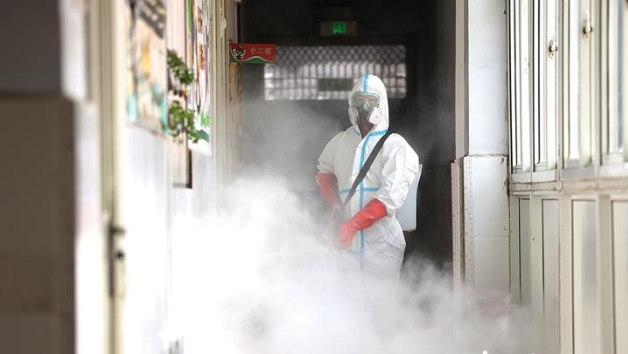 市中區藍天救援隊志愿者在市中區孟莊鎮中學開展預防性消殺。 (記者 甄宗奎 攝)