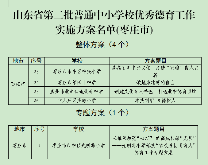 近期,經各市推薦、專家評審,省教育廳擬確定95個整體方案和28個專題方案為全省第二批普通中小學校優秀德育工作實施方案。棗莊市報送的4個整體方案和1個專題方案全部入選公示名單。
