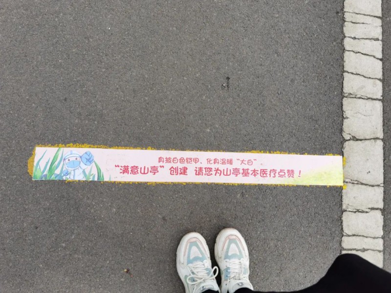 5月11日,在山亭區(qū)城區(qū)新一輪區(qū)域核酸檢測現(xiàn)場,正在等待核酸采樣的群眾發(fā)現(xiàn),原本簡單的“一米間隔線”變成了疫情防控與滿意度創(chuàng)建相結(jié)合的“宣傳貼”,前來做核酸的居民在排隊之余都紛紛低下頭查看,不少群眾還舉起手機(jī)拍照,分享到微信朋友圈。