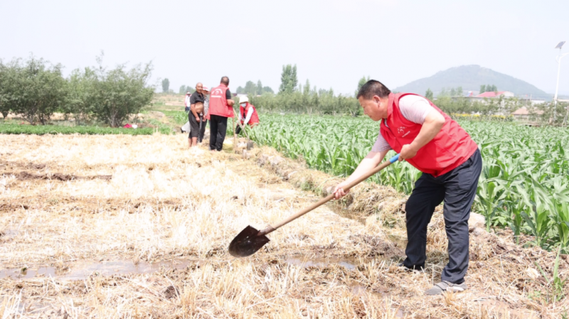 6月13日上午,棗莊市市中區孟莊鎮上道溝村抗旱志愿服務隊正在田間地頭為村民抗旱服務。