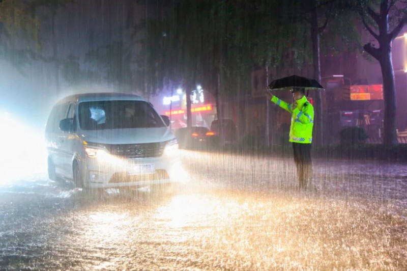 6月26日晚,滕州市交警大隊執勤交警在塔寺路冒雨疏導交通,提醒過往車輛注意行車安全。(來源:上善傳媒)