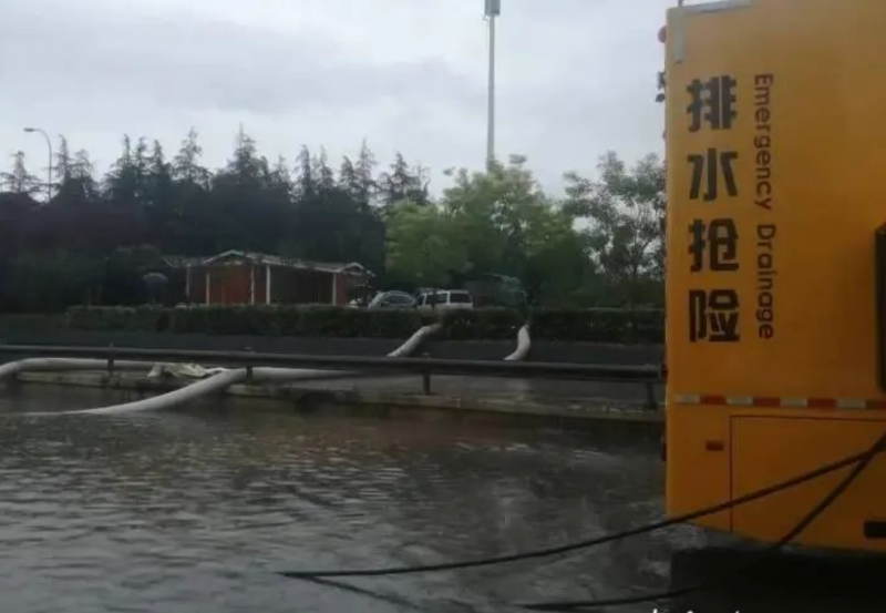 6月27日上午,在市中區南園立交橋,市中區綜合行政執法局工作人員正在運用搶險排澇車進行積水排除作業。(記者 孫越)
