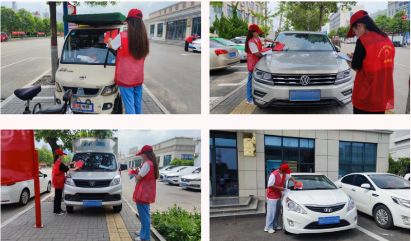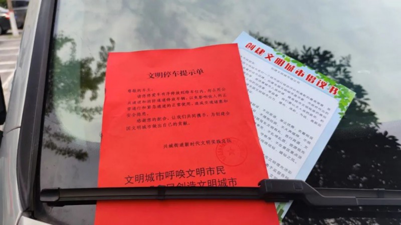 “請您將愛車有序停放到停車位內,勿占用公共通道和消防通道停放車輛……”,7月12日,興城街道創城志愿者向不規范停放的車輛發放“文明停車提示單”。
