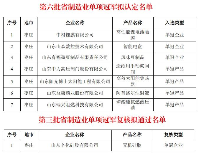 近日,省工信廳公示了第六批省制造業單項冠軍擬認定名單和第三批復核擬通過名單,我市中材鋰膜有限公司、山東山森數控技術有限公司、山東春福盈豆制品有限責任公司、山東中力高壓閥門股份有限公司、山東陽光博士太陽能工程有限公司、山東益康藥業股份有限公司、山東瑞興阻燃科技有限公司7家企業入圍省制造業單項冠軍擬認定名單,實現歷史性突破,我市省單項冠軍累計達到14家。山東辛化硅膠有限公司復核擬通過第三批省制造業單項冠軍。
