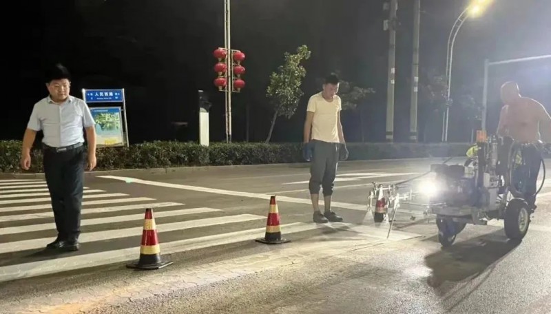 為最大限度地減少對交通秩序的影響和干擾,保障群眾的正常出行,鎮道路辦工作人員放棄休息時間,利用夜間對部分道路斑馬線、圖形標志等模糊處進行重新施劃,以更加整齊、清楚的交通標線,提醒群眾有序出行,保障道路安全。