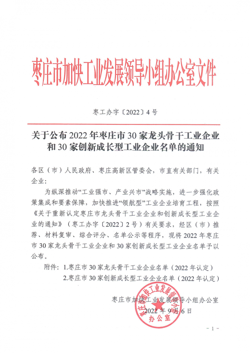 棗莊市30家龍頭骨干工業(yè)企業(yè)名單(2022年認定) 棗莊礦業(yè)(集團)有限責任公司兗礦魯南化工有限公司山東泉興能源集團有限公司聯(lián)泓新材料科技股份有限公司山東恒仁工貿(mào)有限公司盛隆化工有限公司滕州金晶玻璃有限公司滕州東方鋼簾線有限公司魯南中聯(lián)水泥有限公司山東騰達緊固科技股份有限公司尚品本色智能家居有限公司山東辛化硅膠有限公司山東威達重工股份有限公司中材鋰膜有限公司山東濰焦集團薛城能源有限公司遠通紙業(yè)(山東)有限公司棗莊杰富意振興化工有限公司棗莊華潤紙業(yè)有限公司山東華邦能源集團有限公司山東泰和水處理科技股份有限公司山東正凱新材料股份有限公司泉頭集團棗莊金橋旋窯水泥有限公司山東豐源集團股份有限公司山東豐源輪胎制造股份有限公司山東王晁煤電集團有限公司棗莊市恒宇紙業(yè)有限公司山東豐元化學(xué)股份有限公司八億橡膠有限責任公司山東精工電子有限公司華潤三九(棗莊)藥業(yè)有限公司附件2:棗莊市30家創(chuàng)新成長型工業(yè)企業(yè)名單(2022年認定)威智醫(yī)藥有限公司山東恒瑞磁電科技有限公司北玻院(滕州)復(fù)合材料有限公司滕州市三合機械股份有限公司山東山森數(shù)控技術(shù)有限公司山東嘉諾電子有限公司山東大明消毒科技有限公司山東三維鋼結(jié)構(gòu)股份有限公司山東益康藥業(yè)股份有限公司山東茁彼母嬰用品有限公司山東中力高壓閥門股份有限公司山東智贏門窗科技有限公司山東嘉馳新型化工有限公司山東連銀山環(huán)保建材有限公司棗莊市東糧生物科技發(fā)展有限公司山東歐樂食品有限公司中建材光芯科技有限公司山東康力醫(yī)療器械科技有限公司山東紅三葉鋼結(jié)構(gòu)工程有限公司山東瑞興阻燃科技有限公司山東芯恒光科技有限公司棗莊市泰瑞精細化工有限公司華玥鉆業(yè)(山東)工藝飾品有限公司棗莊市瑞隆機械制造有限公司天科新能源有限責任公司山東明源智能裝備科技有限公司棗莊鑫金山智能裝備有限公司山東天瀚新能源科技有限公司山東天潤新能源材料有限公司山東鵬耀智佳精密工業(yè)有限公司