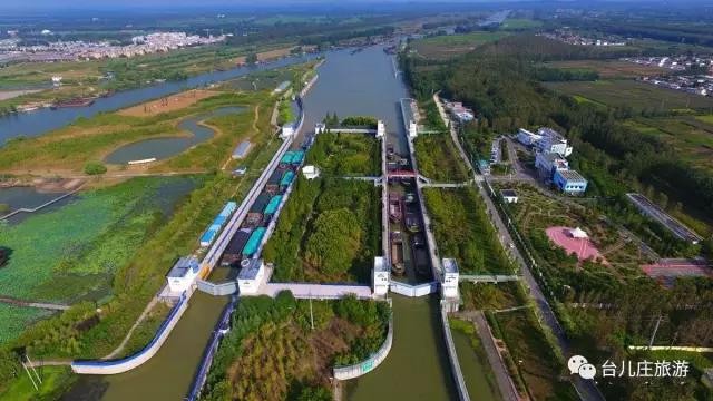 空中鳥瞰臺兒莊運河上的繁忙的臺兒莊船閘、臺兒莊復線船閘。 產”。