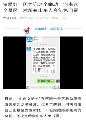 菏澤市第三人民醫院護士賀愛紅在河南洛陽景區救人善舉,刷爆朋友圈和抖音,話題#白云山景區今年對山東人免門票#登上了熱搜。河南洛陽白云山景區為感謝她,不但給她終身免票的獎勵,還決定給全山東人免門票。