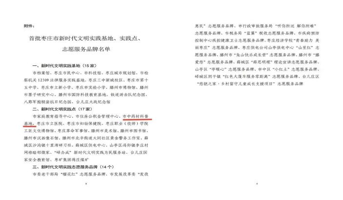 近日,棗莊市精神文明建設委員會辦公室印發《關于公布棗莊市首批新時代文明實踐基地、實踐點、志愿服務品牌的通報》,棗莊市中藥材科普基地(市中藥材科普館)被命名為棗莊市首批新時代文明實踐點。